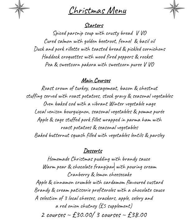 Pre - Orders only please - minimum table order of 4 persons -Three Courses £38.00 per person, Two Courses £30.00